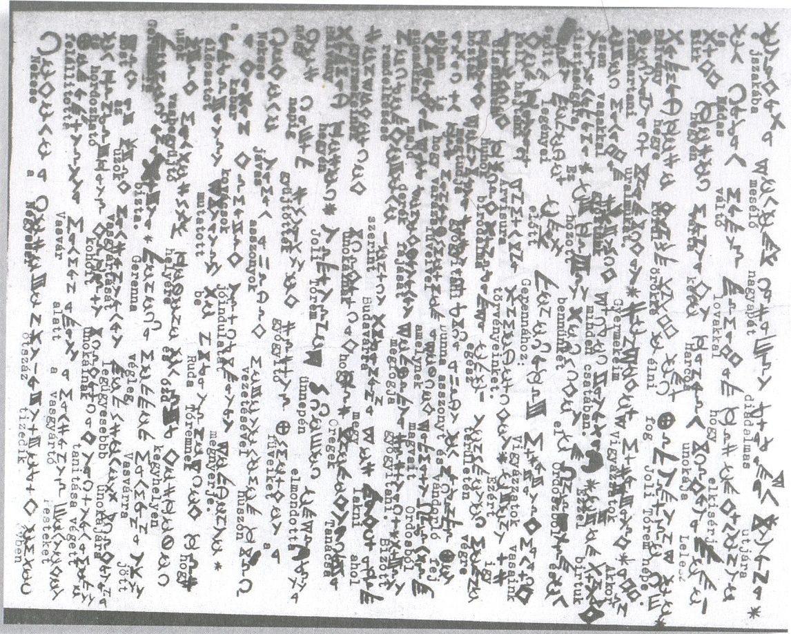 A következő kép a Vérrel pecsételvéből van. Ez valószínűleg Paál Zoltán mintája, hogy így írta volna újra az Arvisurákat, ha rovásokat használt volna, ill. az eredetiekhez hasonló kinézetet próbált volna elérni:(Paál Zoltán a kézírást, ill. később a gépelést választotta, részben az érthetőség miatt, részben pedig, hogy gyorsabban haladjon és a hatalmas anyag minél nagyobb részét ismertethesse.)